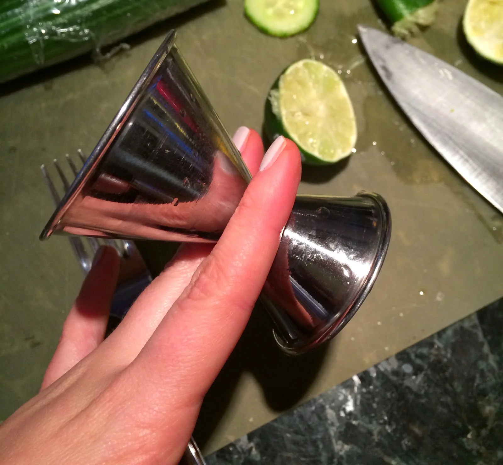 A jigger is a metal double-ended shot glass that looks a bit like a wonky hourglass. It usually measures 2 ounces on one end and 1 ounce on the other. You can just use a regular shot glass, of course, but make sure you know exactly how much it measures. There's no real standard, so you could be pouring anywhere from 0.75 ounce to 2 ounces without realising it. For years I wondered why all my friends complained that my drinks were too strong--as it turns out, before I got a jigger I was using a Marine Corps stamped shot glass that was a deceptive 2 ounces instead of 1. Whoops.