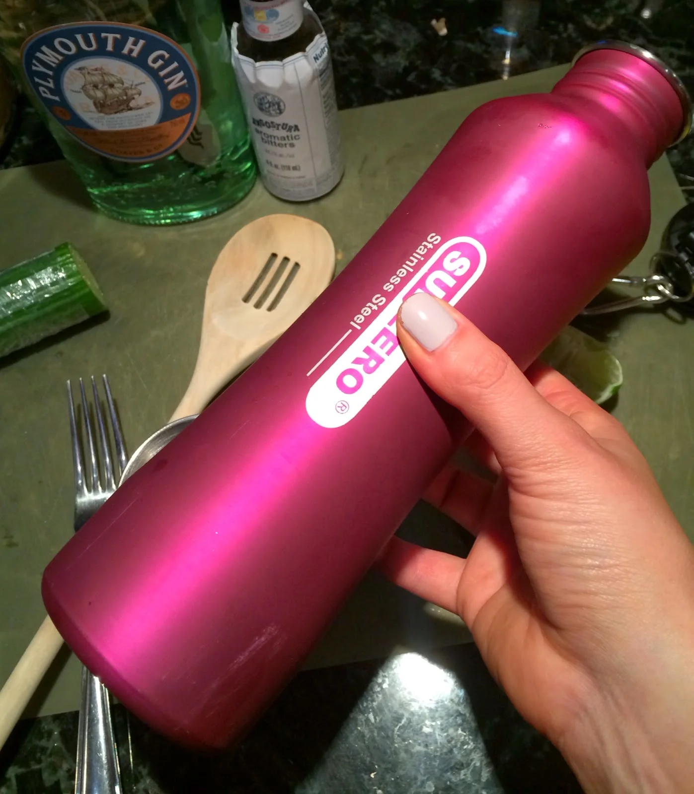 So I just use one of these water bottles! It's metal and it has a small opening that makes straining a breeze. Make do, bitches.